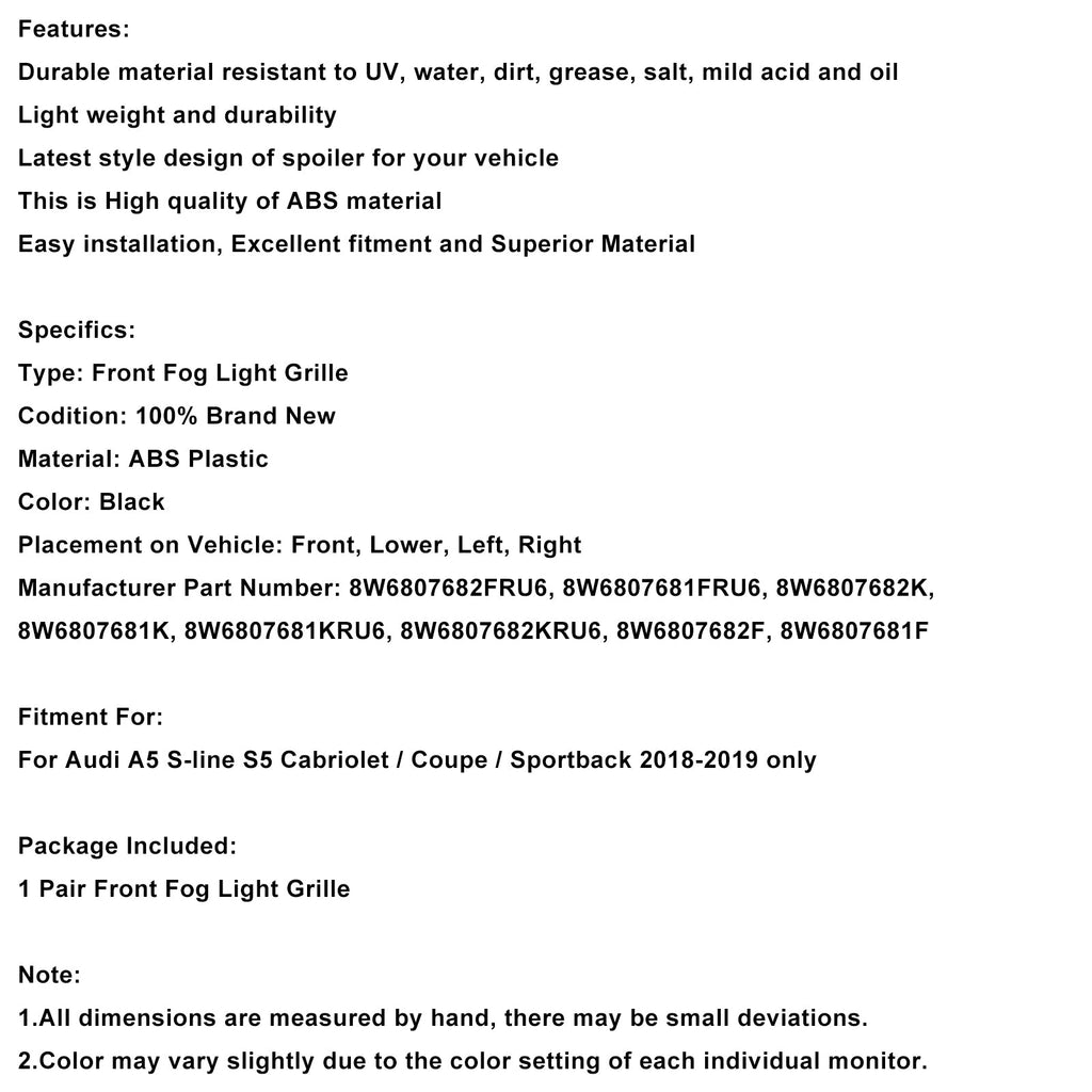 Front Bumper Fog Light Grille Cover Grill Fit Audi A5 S-Line S5 2018-2019