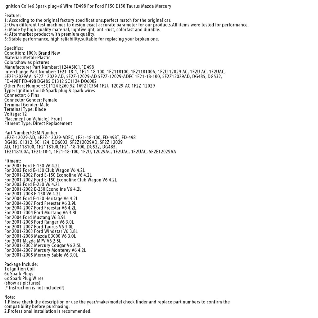 Ignition Coil+6 Spark plug+6 Wire FD498 For Ford F150 E150 Taurus Mazda Mercury