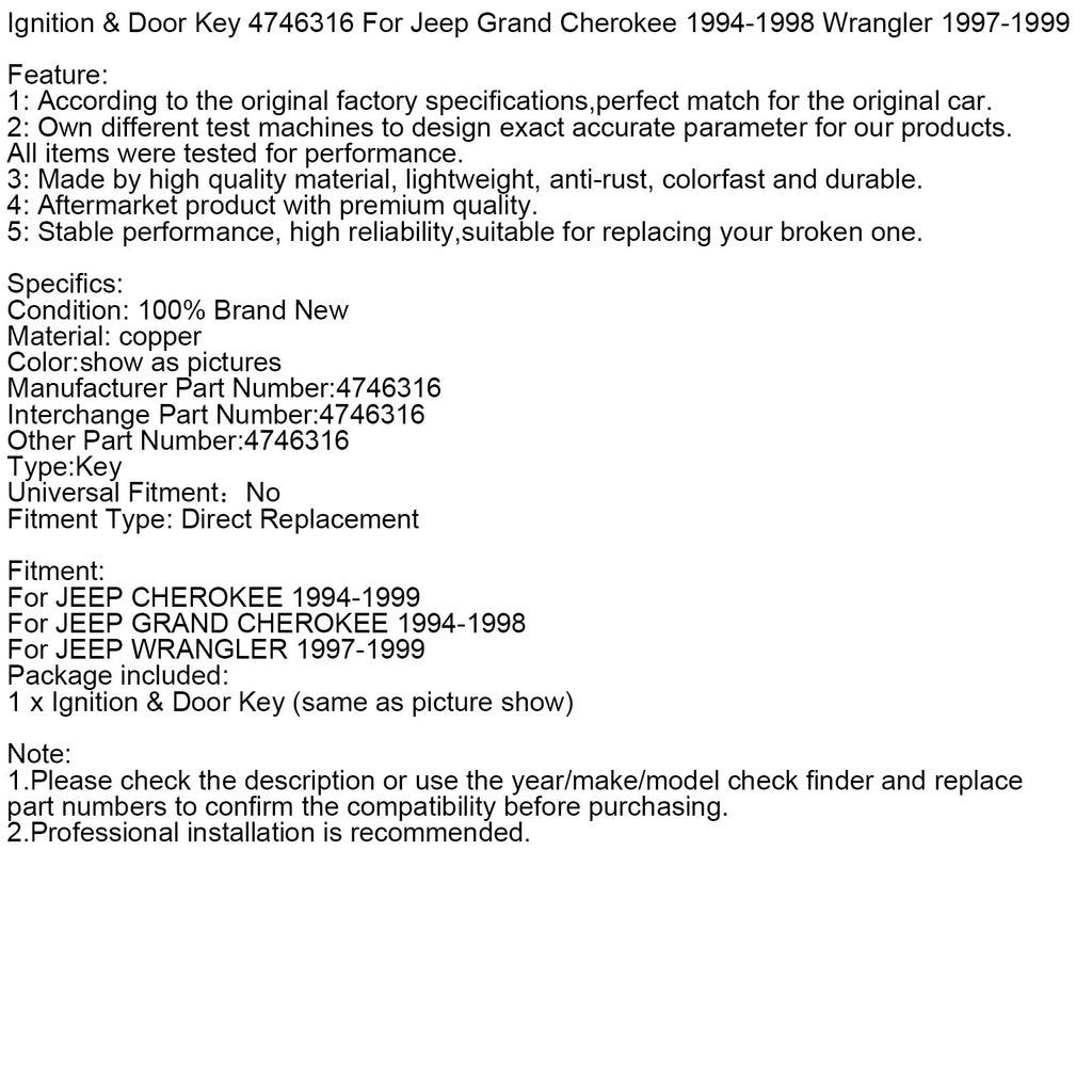 Ignition & Door Key 4746316 For Jeep Grand Cherokee 1994-1998 Wrangler 1997-1999