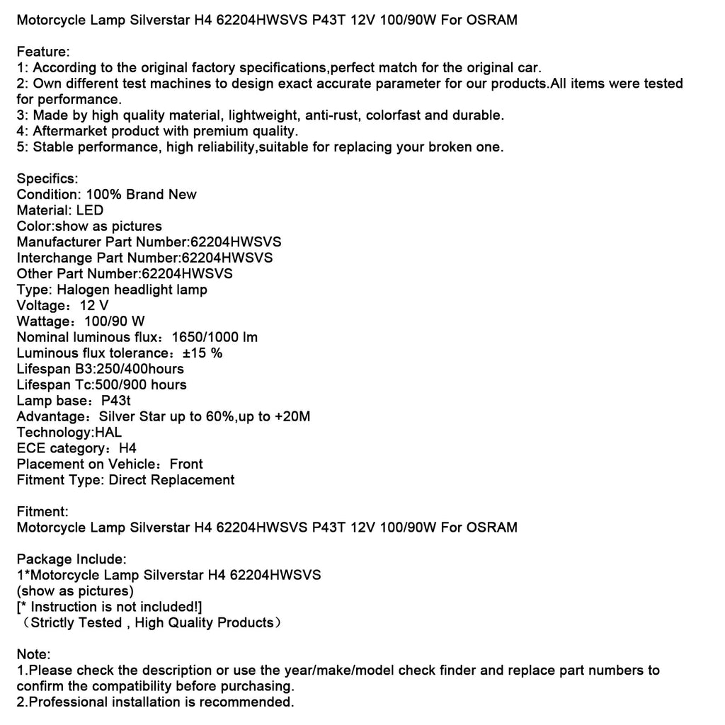 Motorcycle Lamp Silverstar H4 62204HWSVS P43T 12V 100/90W For OSRAM