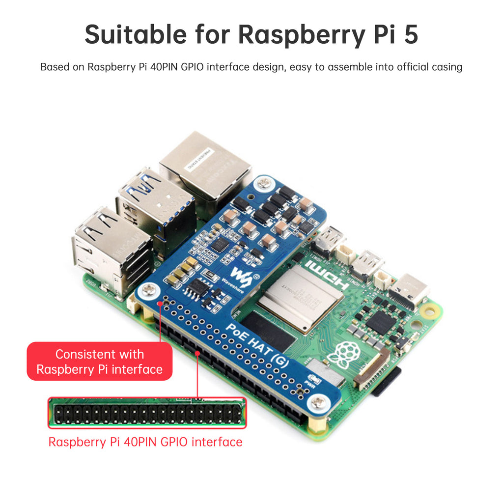 A Power over Ethernet (PoE) expansion board for Raspberry Pi5, supporting IEEE802.3af/at network standards. Suitable for use with PoE routers or switches that support IEEE 802.3af/at network standards. Only one network cable is needed to connect the Raspberry Pi to the Internet and power it.