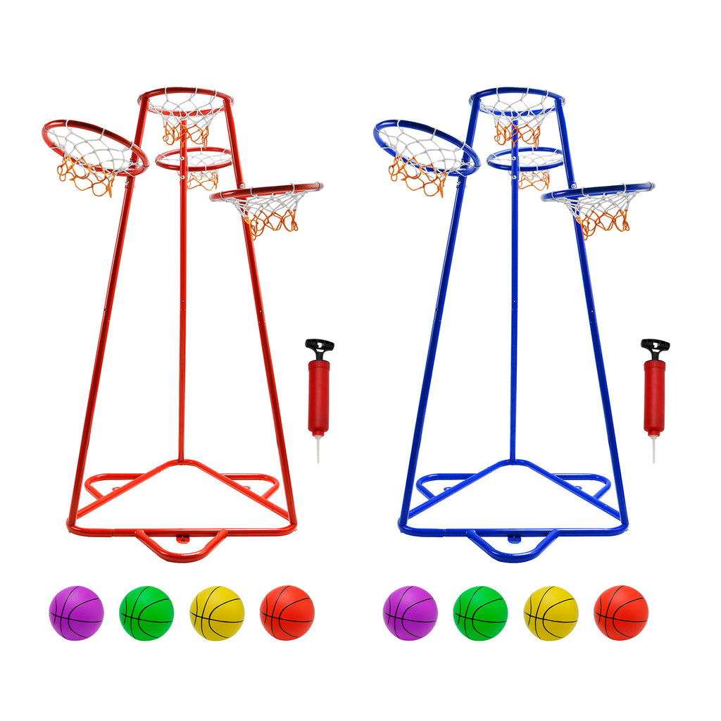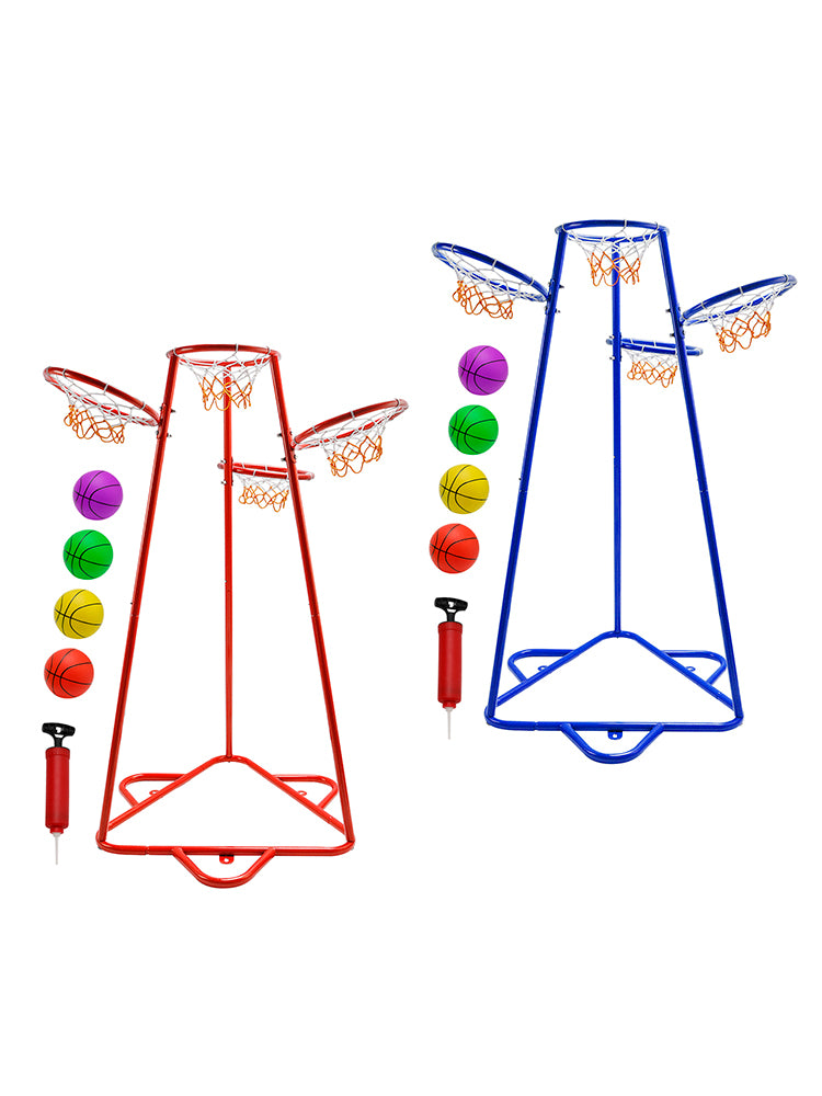 Promote gross motor activities and physical play with a 4-Hoop Basketball Play Set that can be used indoors or outdoors. Children can engage in group play or individual play using the netted hoops arranged at different heights.