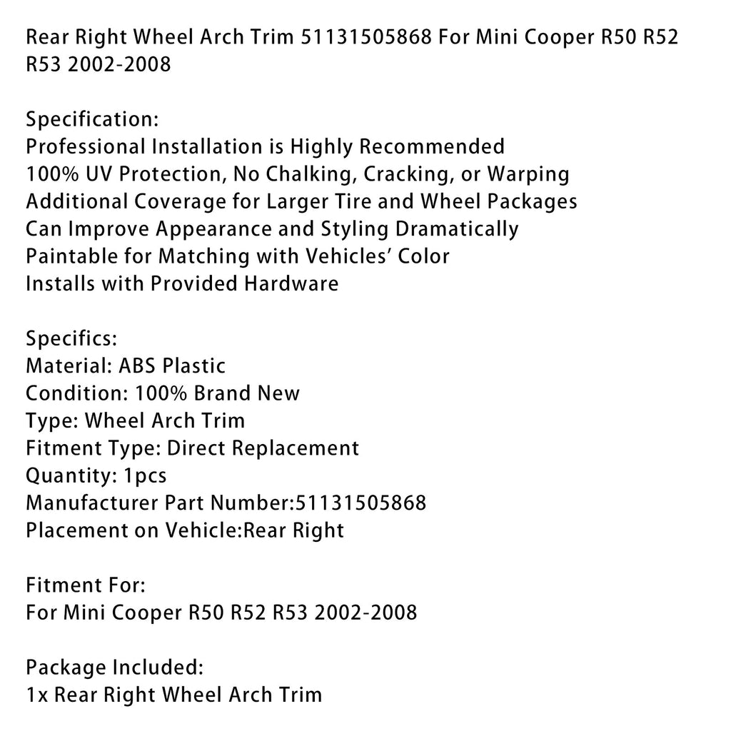Rear Right Wheel Arch Trim 51131505868 For Mini Cooper R50 R52 R53 2002-2008