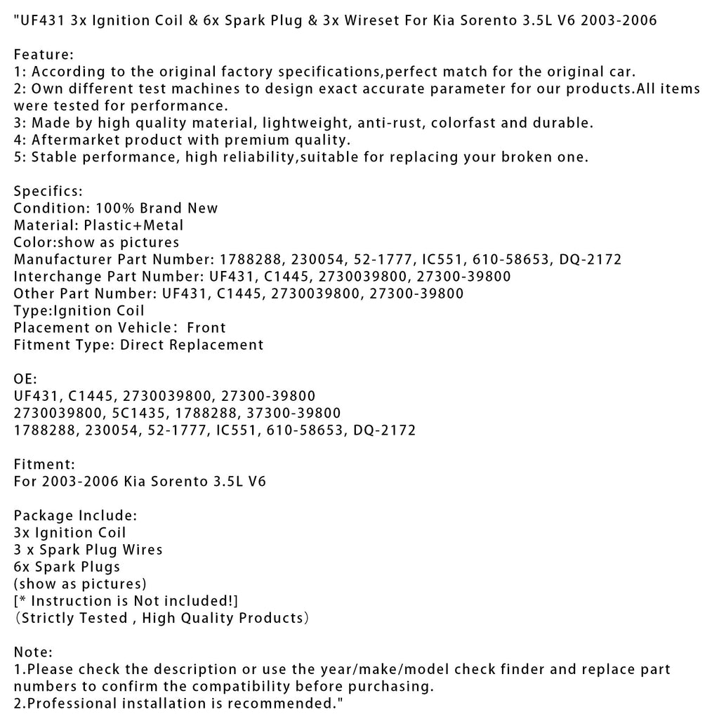 UF431 3x Ignition Coil & 6x Spark Plug & 3x Wireset For Kia Sorento 3.5L V6 2003-2006