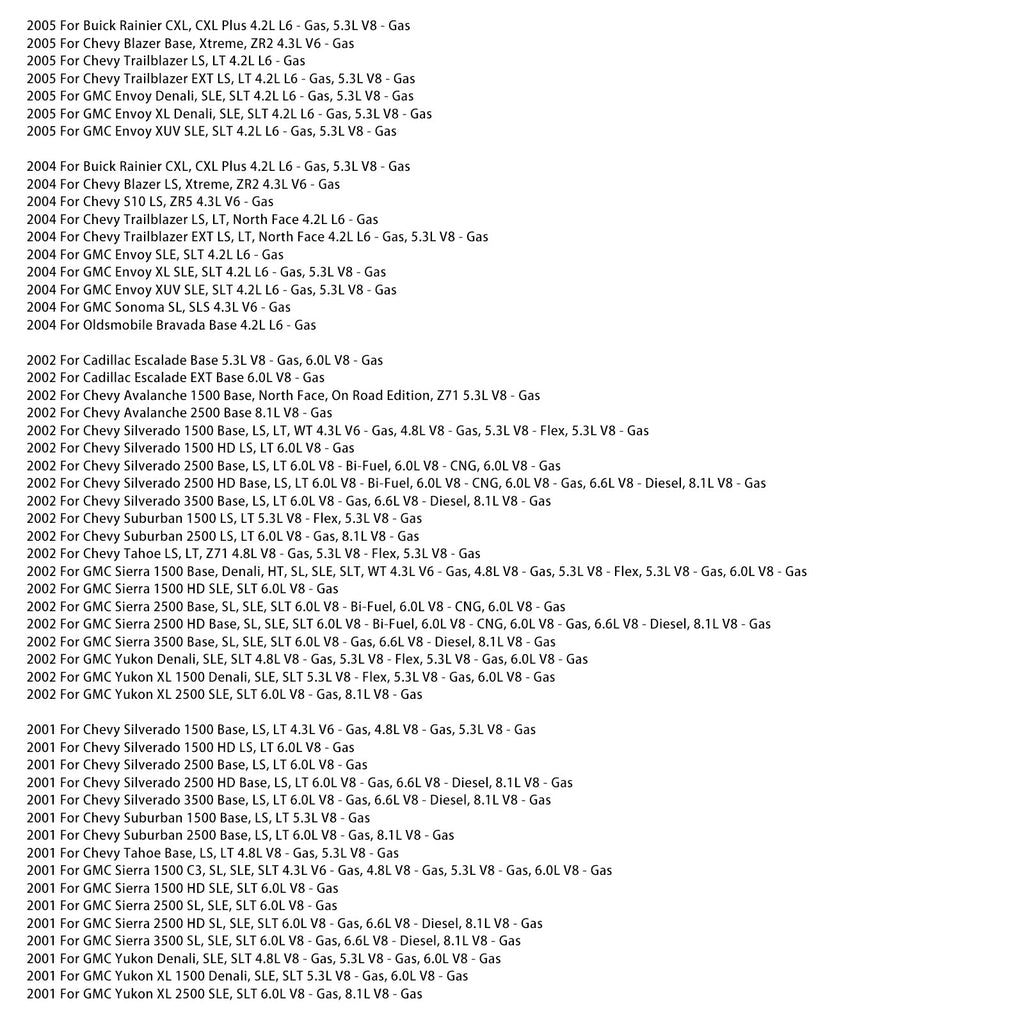 2002 For GMC Yukon Denali, SLE, SLT 4.8L V8 - Gas, 5.3L V8 - Flex, 5.3L V8 - Gas, 6.0L V8 - Gas