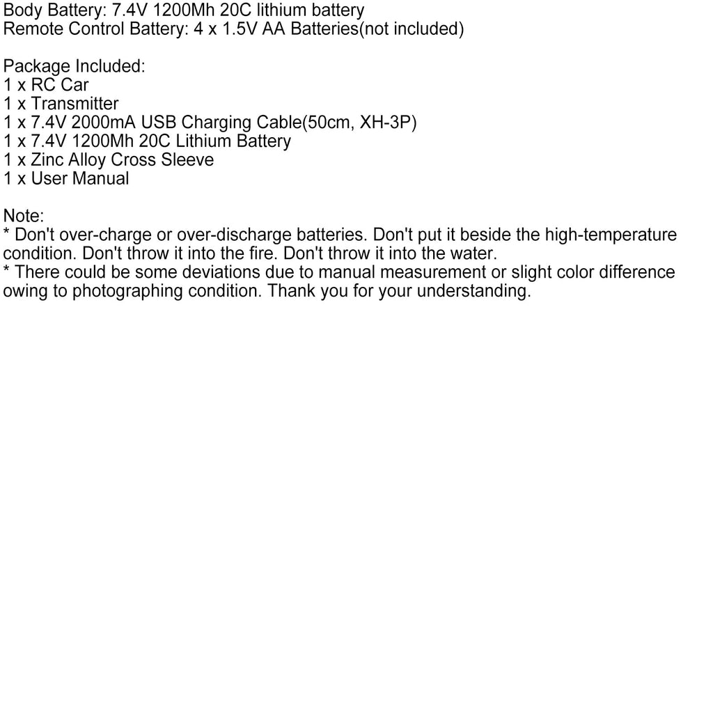 4.USB CHARGER AND BATTERY - The USB charger for the battery is convenient to charge and has several functions. Powered by 7.4V 1200Mh 20C lithium rechargeable battery for 9 mins play time.