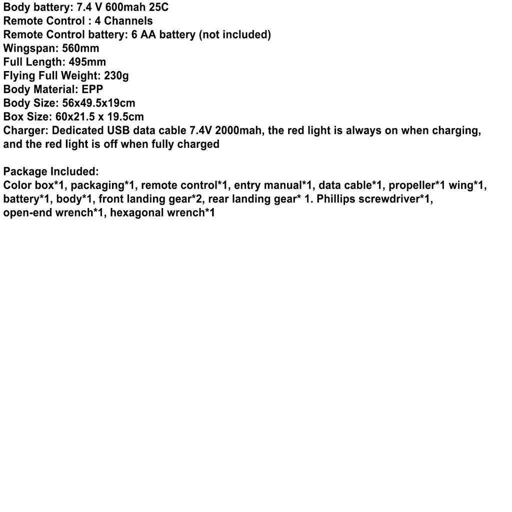 Color box*1, packaging*1, remote control*1, entry manual*1, data cable*1, propeller*1 wing*1, battery*1, body*1, front landing gear*2, rear landing gear* 1. Phillips screwdriver*1, open-end wrench*1, hexagonal wrench*1