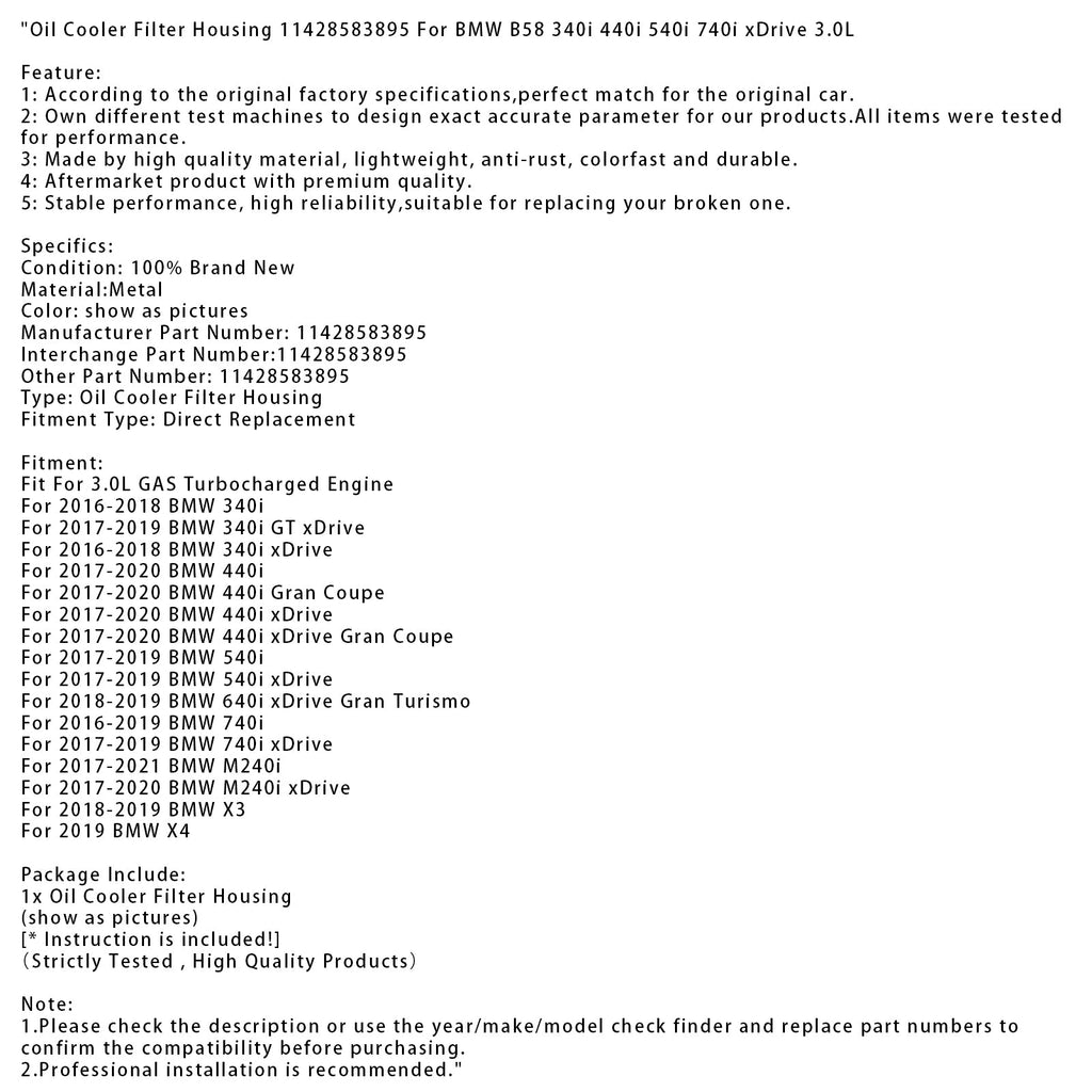 Oil Cooler Filter Housing 11428583895 For BMW B58 340i 440i 540i 740i xDrive 3.0L