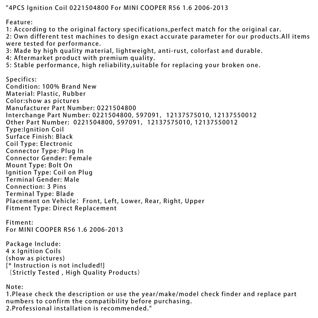4PCS Ignition Coil 0221504800 For MINI COOPER R56 1.6 2006-2013