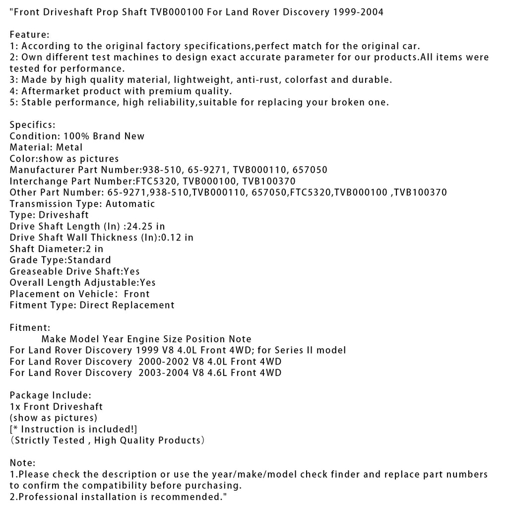 Front Driveshaft Prop Shaft TVB000100 For Land Rover Discovery 1999-2004