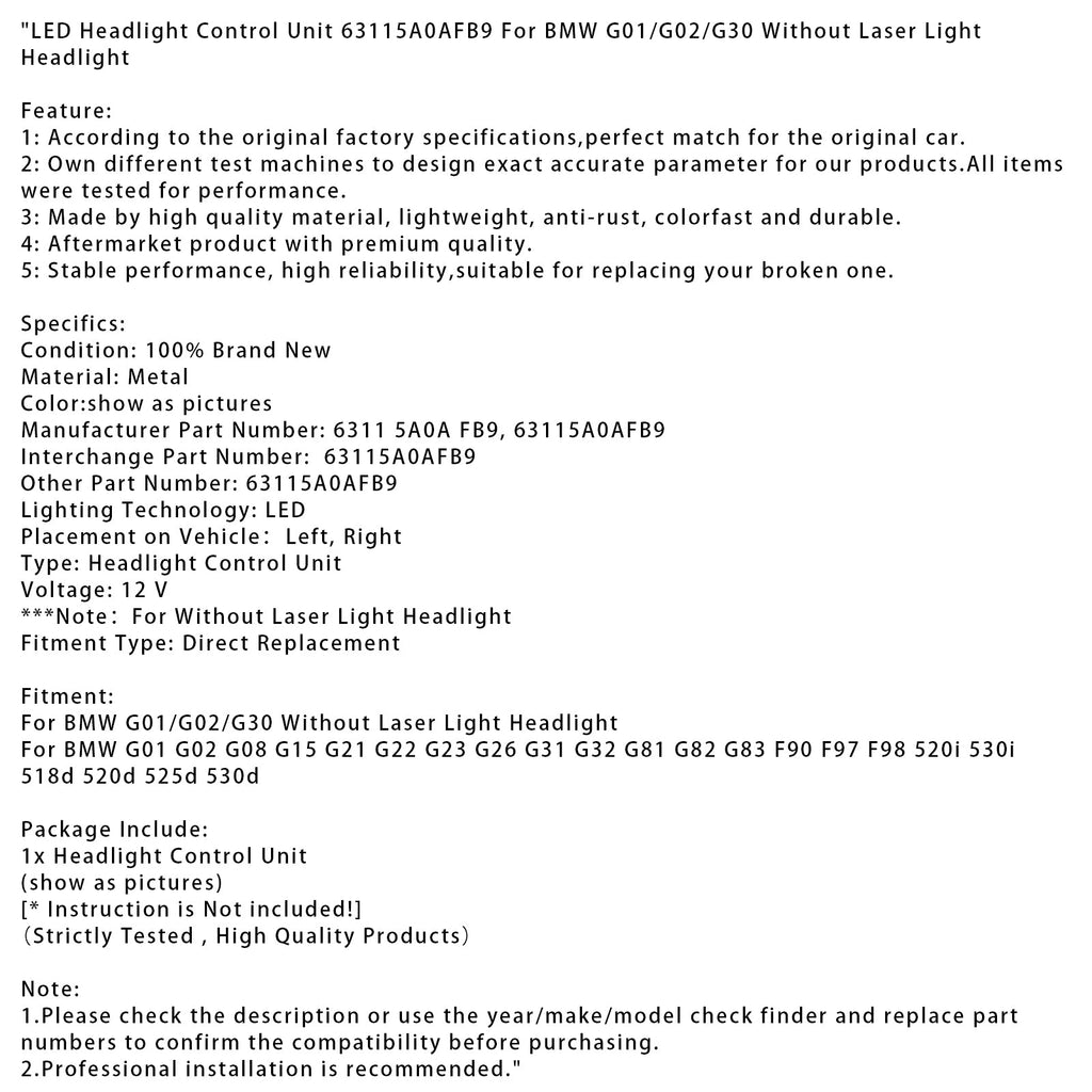 LED Headlight Control Unit 63115A0AFB9 For BMW G01/G02/G30 Without Laser Light Headlight