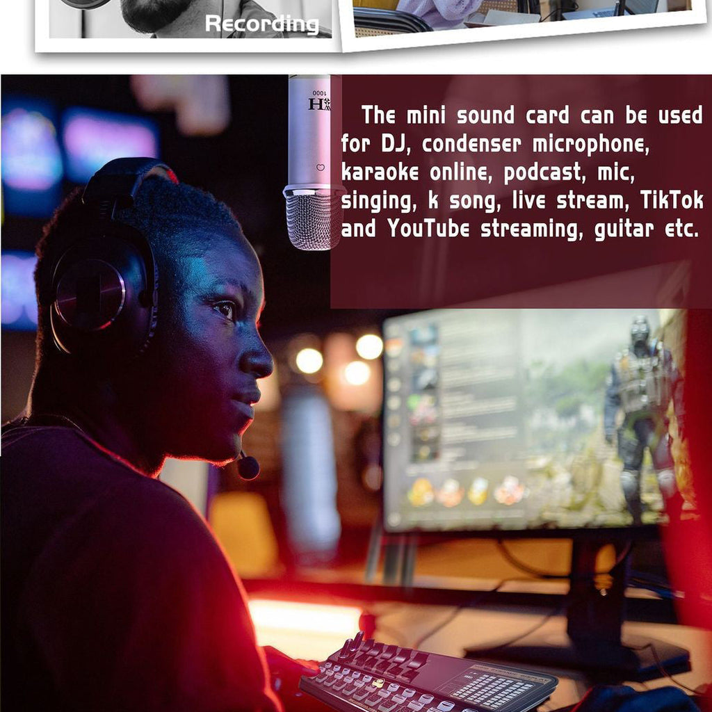 The mini sound card can be used for DJ, condenser microphone, karaoke online, podcast, mic,singing, k song, live stream, TikTok and YouTube streaming, guitar etc.