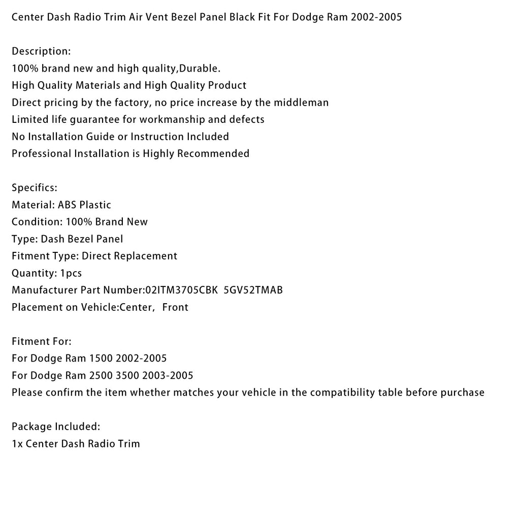 Center Dash Radio Trim Air Vent Bezel Panel Black Fit For Dodge Ram 2002-2005