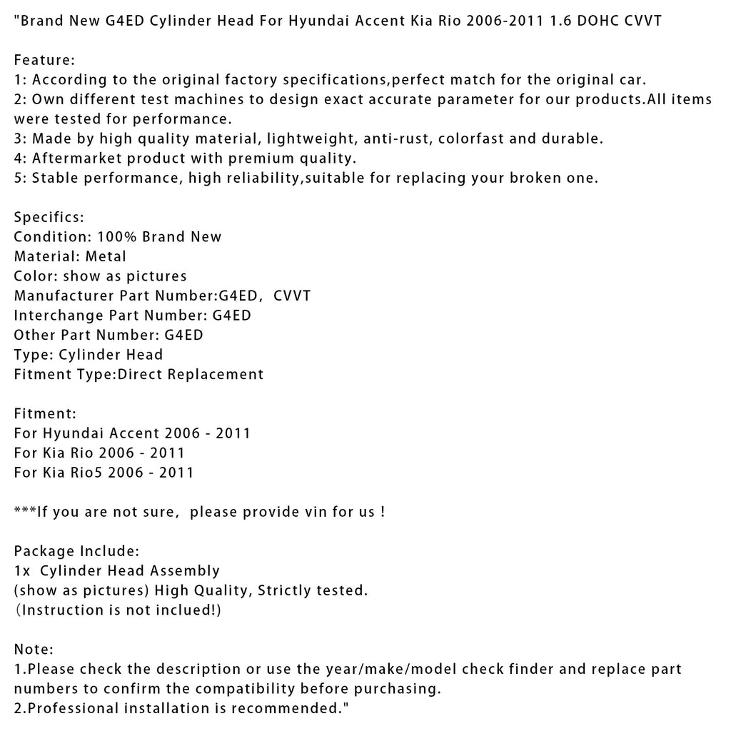 Brand New G4ED Cylinder Head For Hyundai Accent Kia Rio 2006-2011 1.6 DOHC CVVT