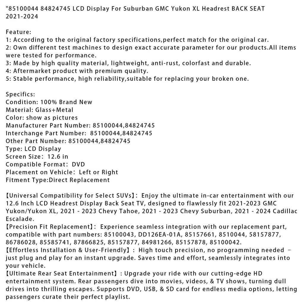 【Universal Compatibility for Select SUVs】:Enjoy the ultimate in-car entertainment with our 12.6 Inch LCD Headrest Display Back Seat TV, designed to flawlessly fit 2021-2023 GMC Yukon/Yukon XL, 2021 - 2023 Chevy Tahoe, 2021 - 2023 Chevy Suburban, 2021 - 2024 Cadillac Escalade.