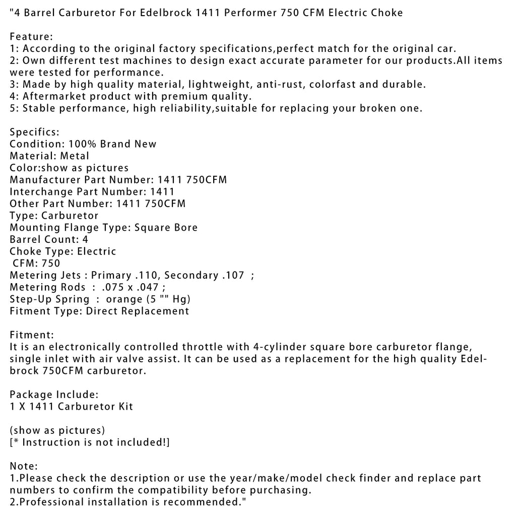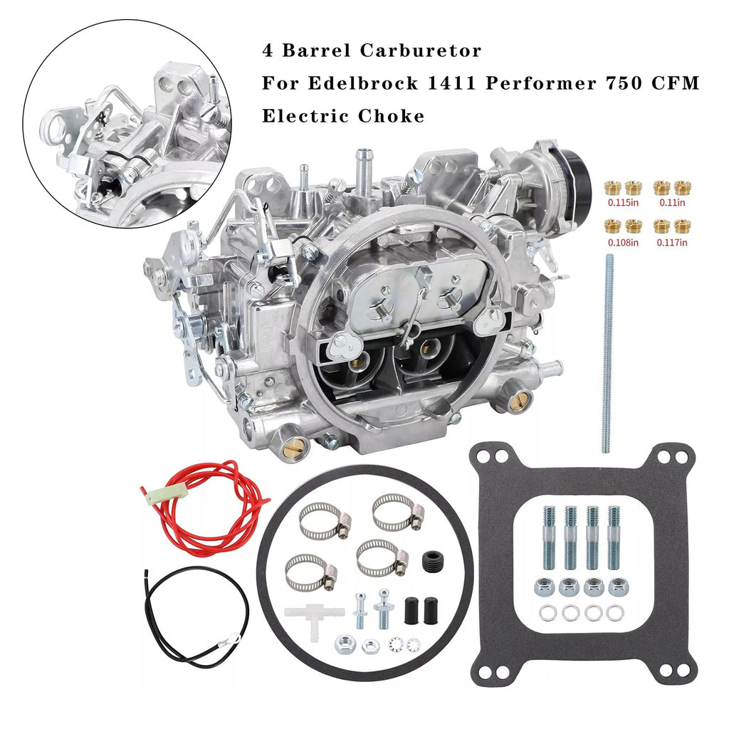 4기통 사각 보어 기화기 플랜지, 공기 밸브 보조 기능이 있는 단일 흡입구가 있는 전자 제어식 스로틀입니다. 고품질 Edelbrock 750CFM 기화기를 대체하여 사용할 수 있습니다.