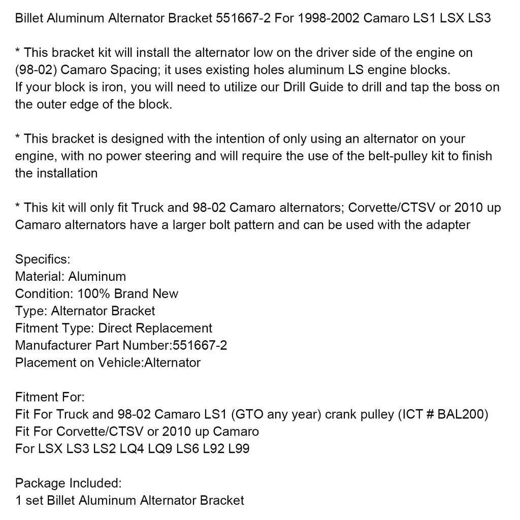 * This bracket kit will install the alternator low on the driver side of the engine on (98-02) Camaro Spacing; it uses existing holes aluminum LS engine blocks.