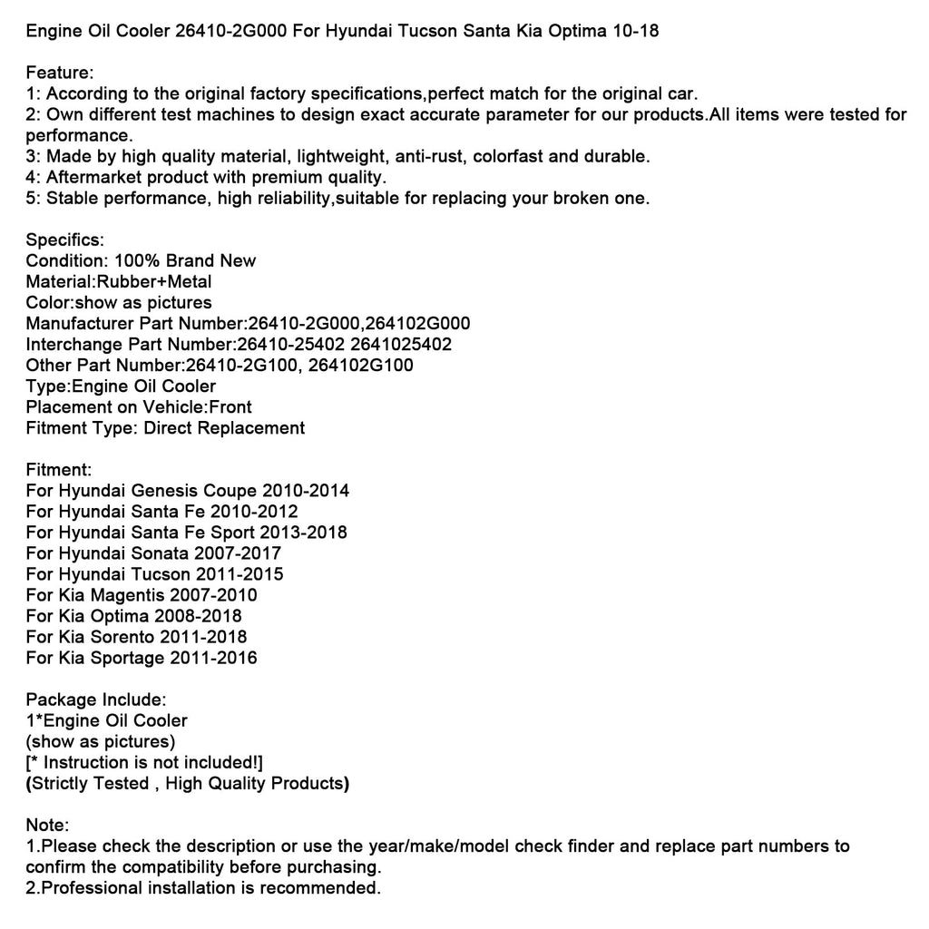 Engine Oil Cooler 26410-2G000 Fit For Hyundai Tucson Santa Kia Optima 10-18