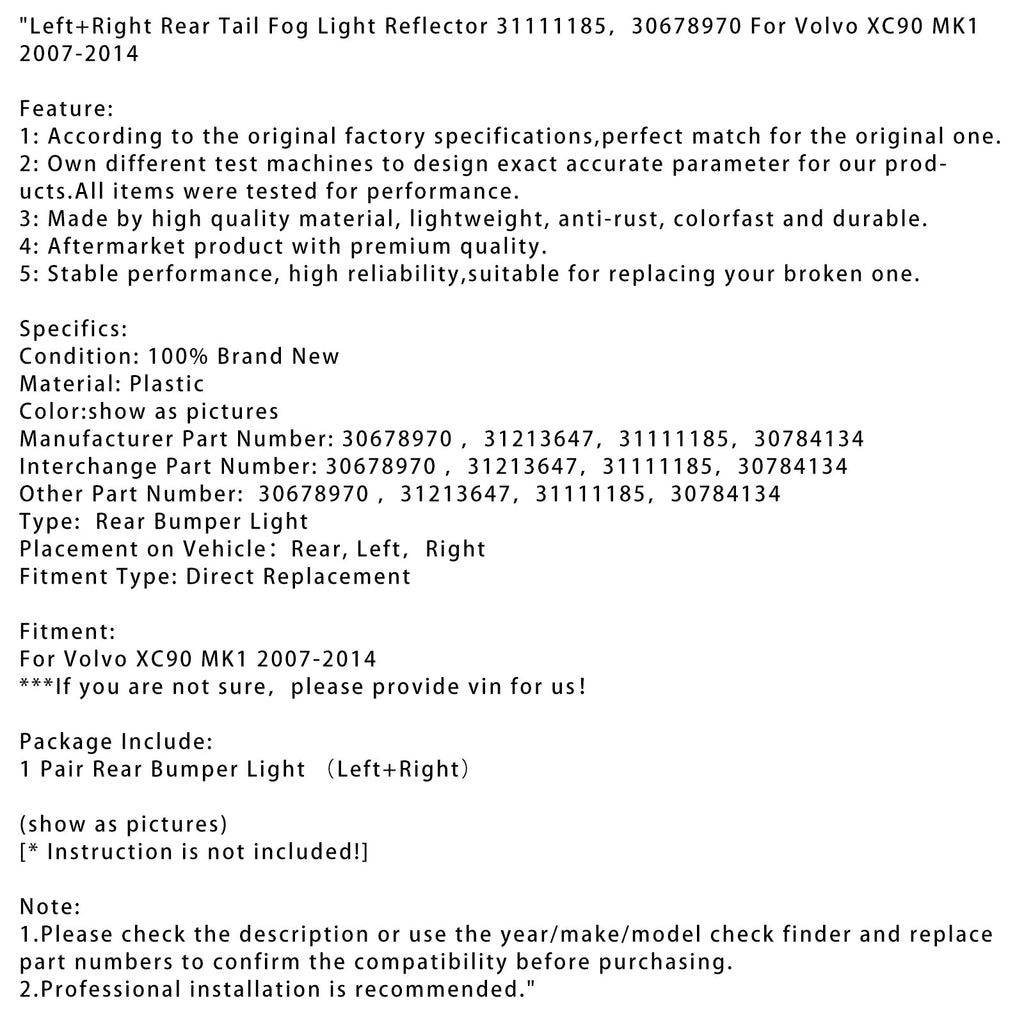 볼보 XC90 MK1 2007-2014용 좌+우 후방 테일 안개등 반사경 31111185, 30678970