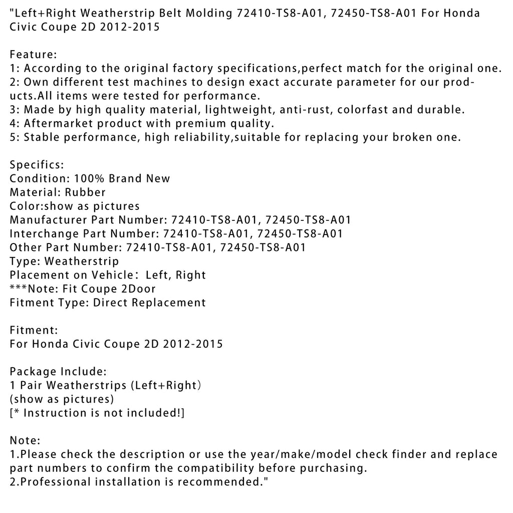 Honda Civic Coupe 2D 2012-2015용 좌우 웨더스트립 벨트 몰딩 72410-TS8-A01, 72450-TS8-A01