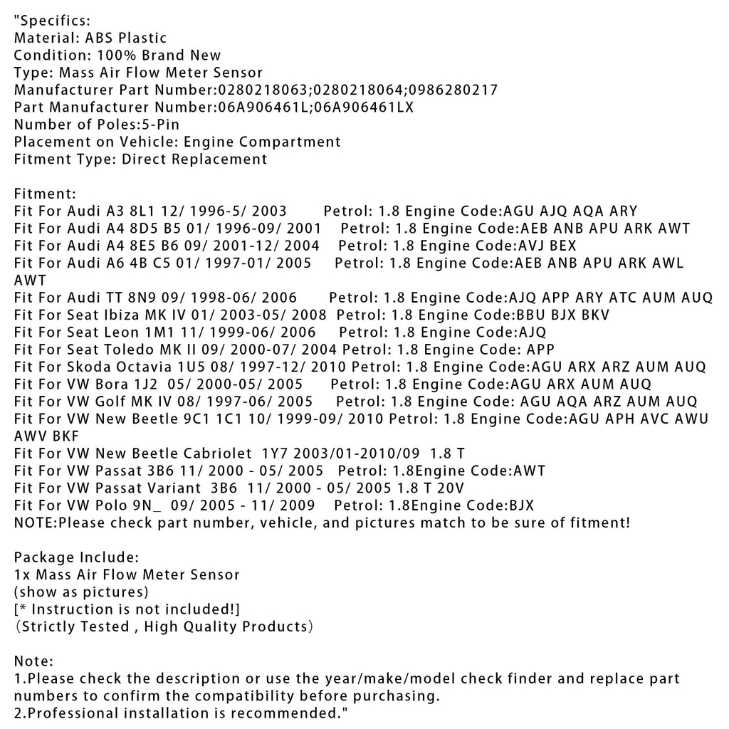 Mass Air Flow Meter Sensor For Audi A4 TT VW Golf IV Bora 1.8T 0280218063