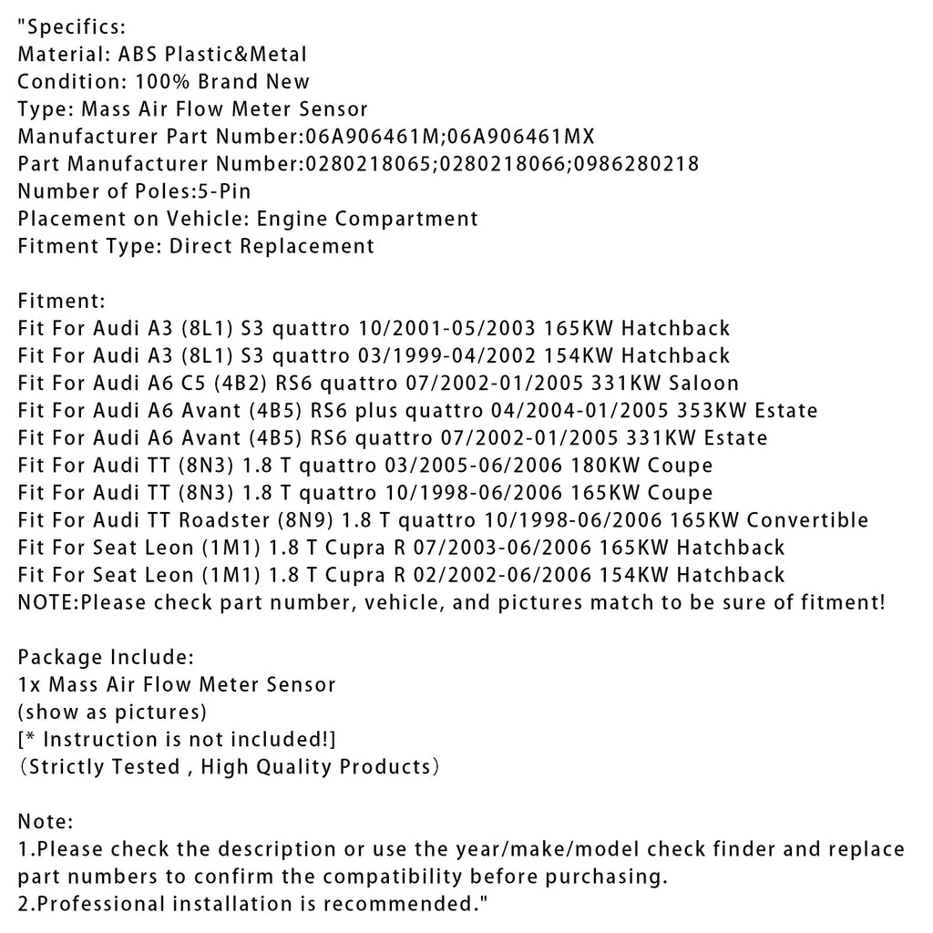 Mass Air Flow Meter Sensor For Audi TT RS6 Avant Leon 0280218065
