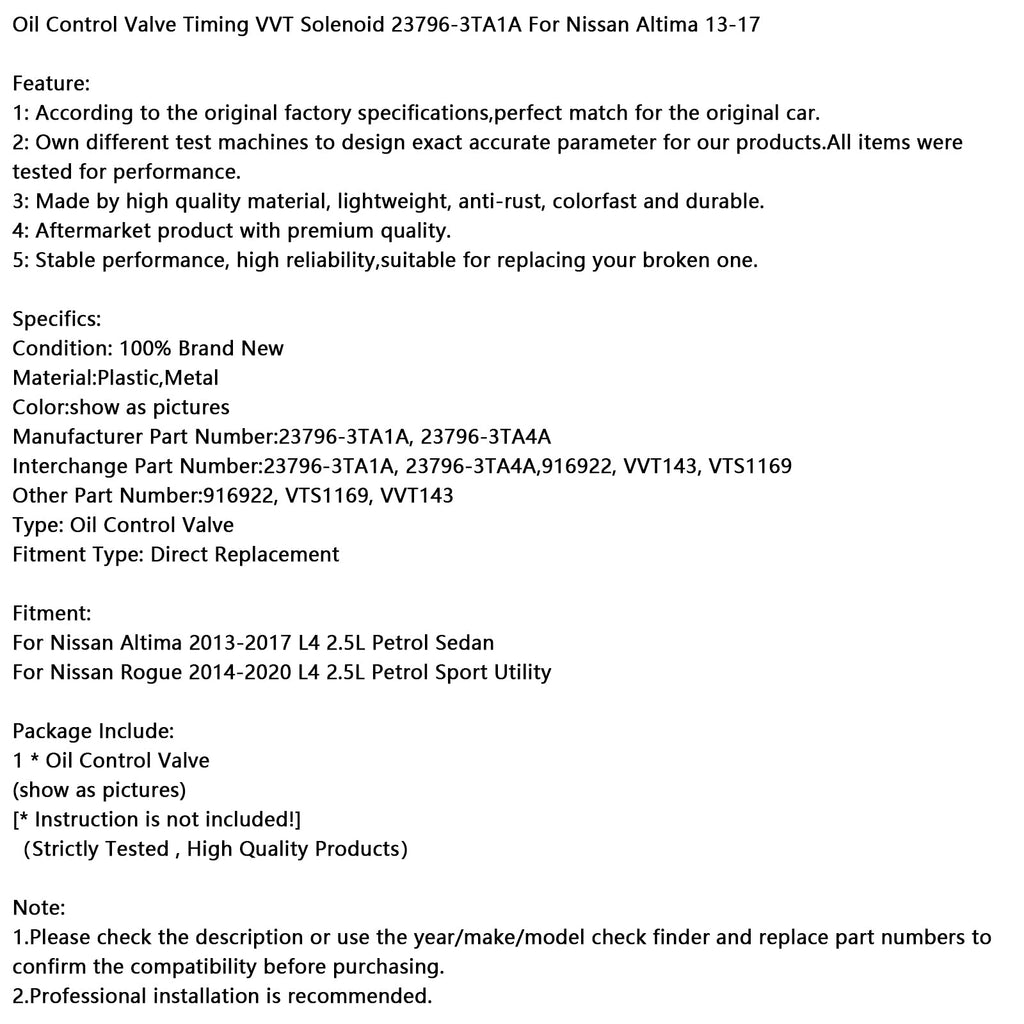 Interchange Part Number:23796-3TA1A, 23796-3TA4A,916922, VVT143, VTS1169