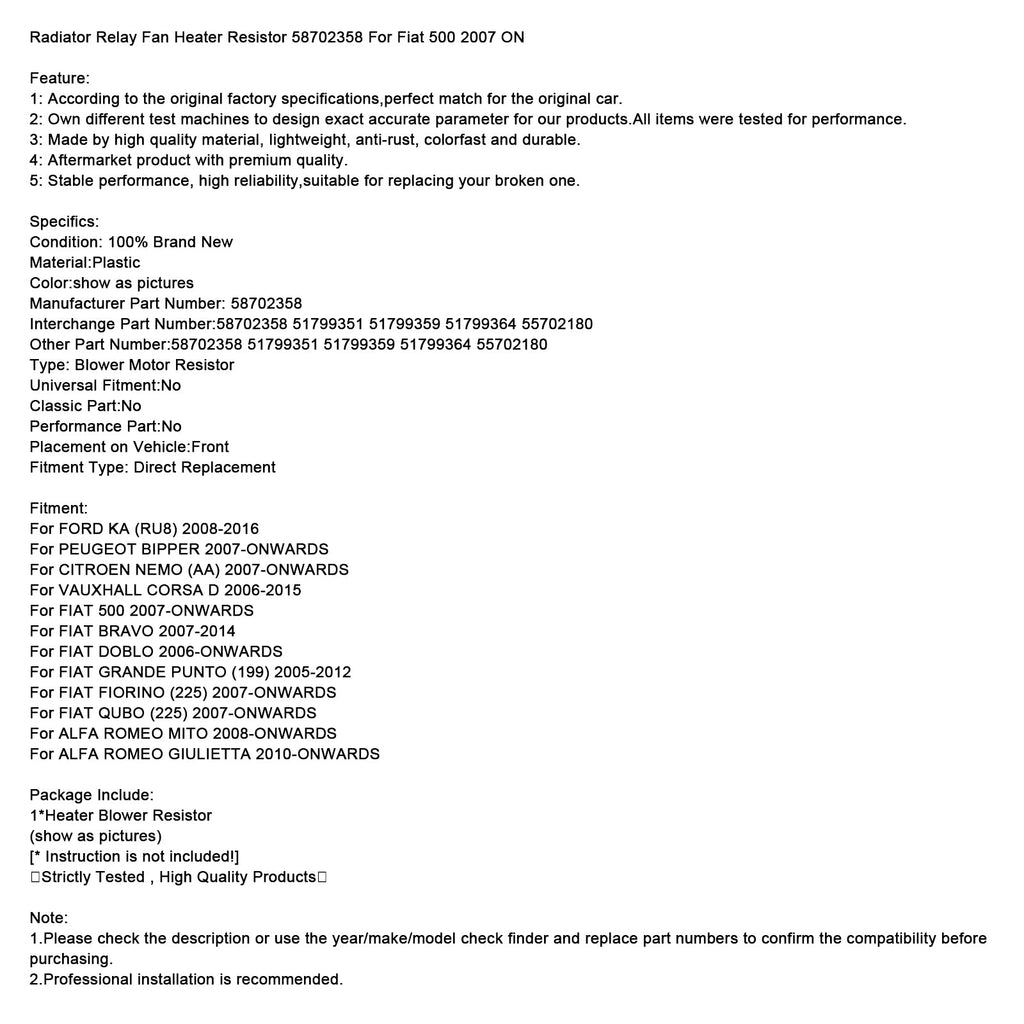 Radiator Relay Fan Heater Resistor 58702358 For Fiat 500 2007 ON