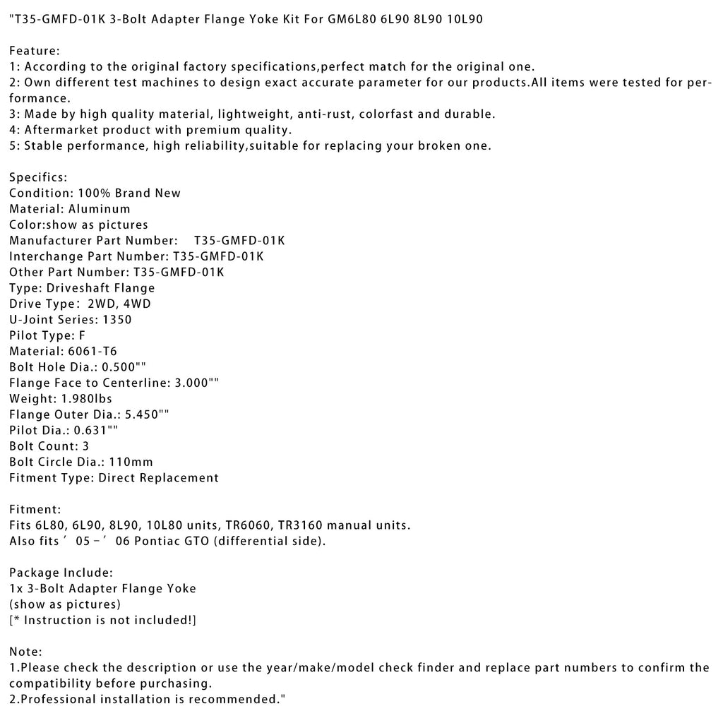 T35-GMFD-01K GM6L80 6L90 8L90 10L90용 3볼트 어댑터 플랜지 요크 키트