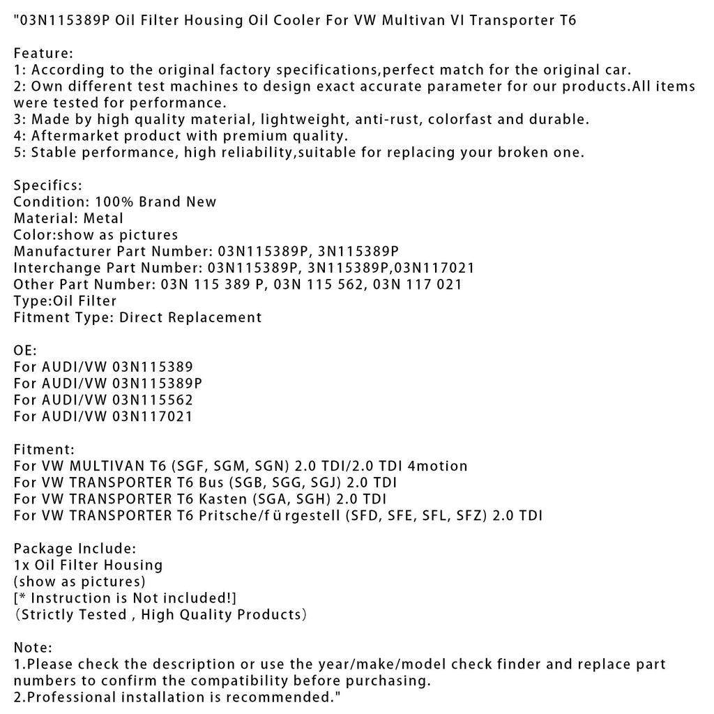 03N115389P Oil Filter Housing Oil Cooler For VW Multivan VI Transporter T6