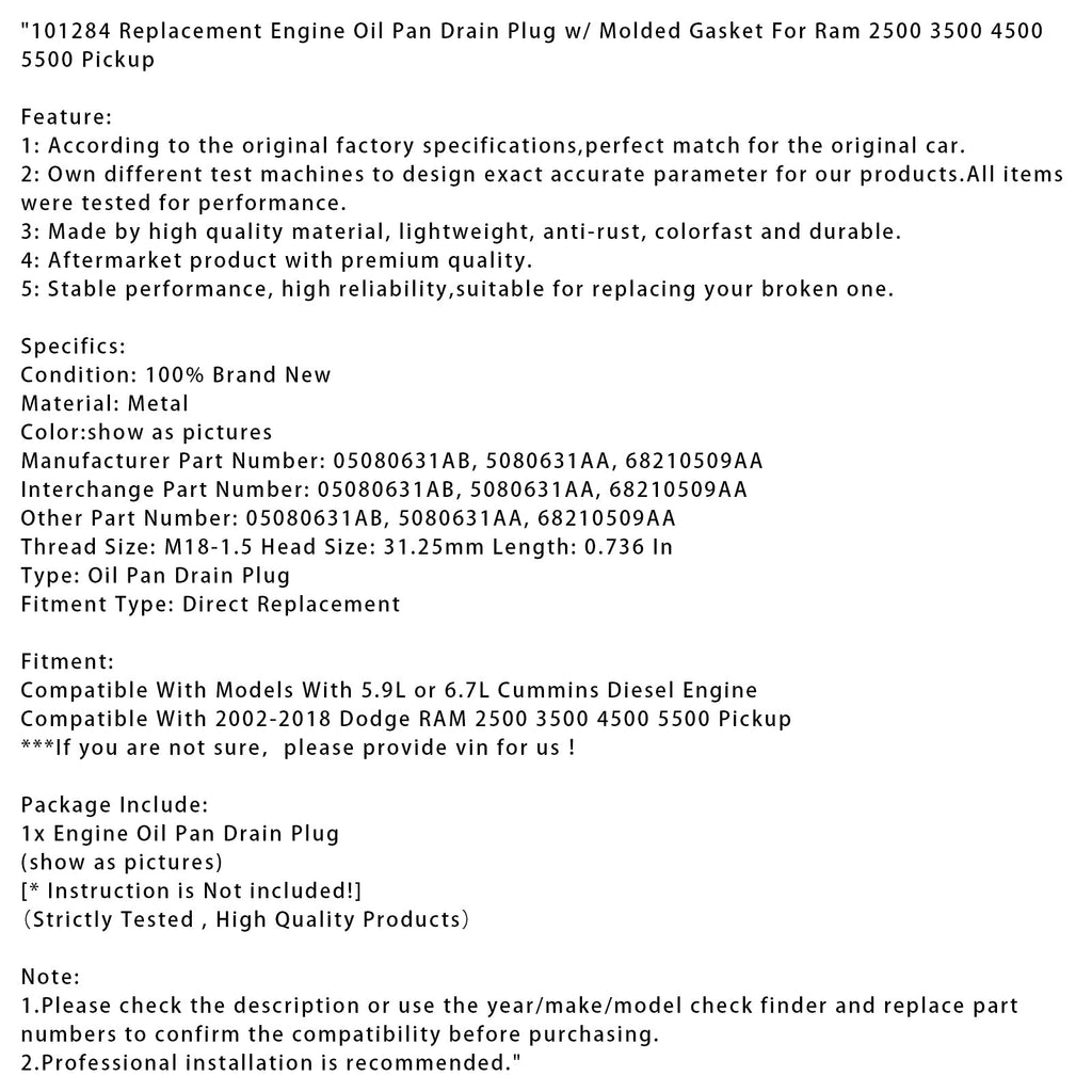 101284 Replacement Engine Oil Pan Drain Plug w/ Molded Gasket For Ram 2500 3500 4500 5500 Pickup