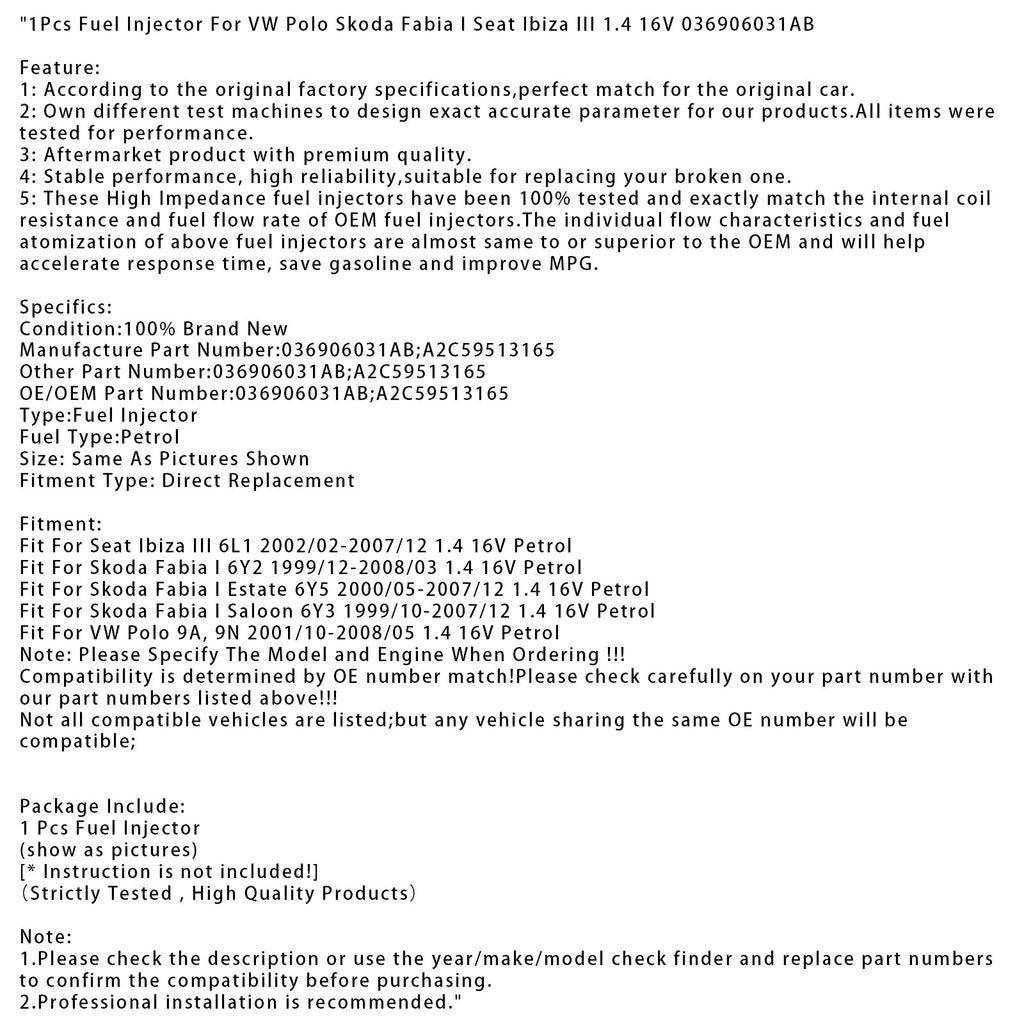 1Pcs Fuel Injector For VW Polo Skoda Fabia I Seat Ibiza III 1.4 16V 036906031AB