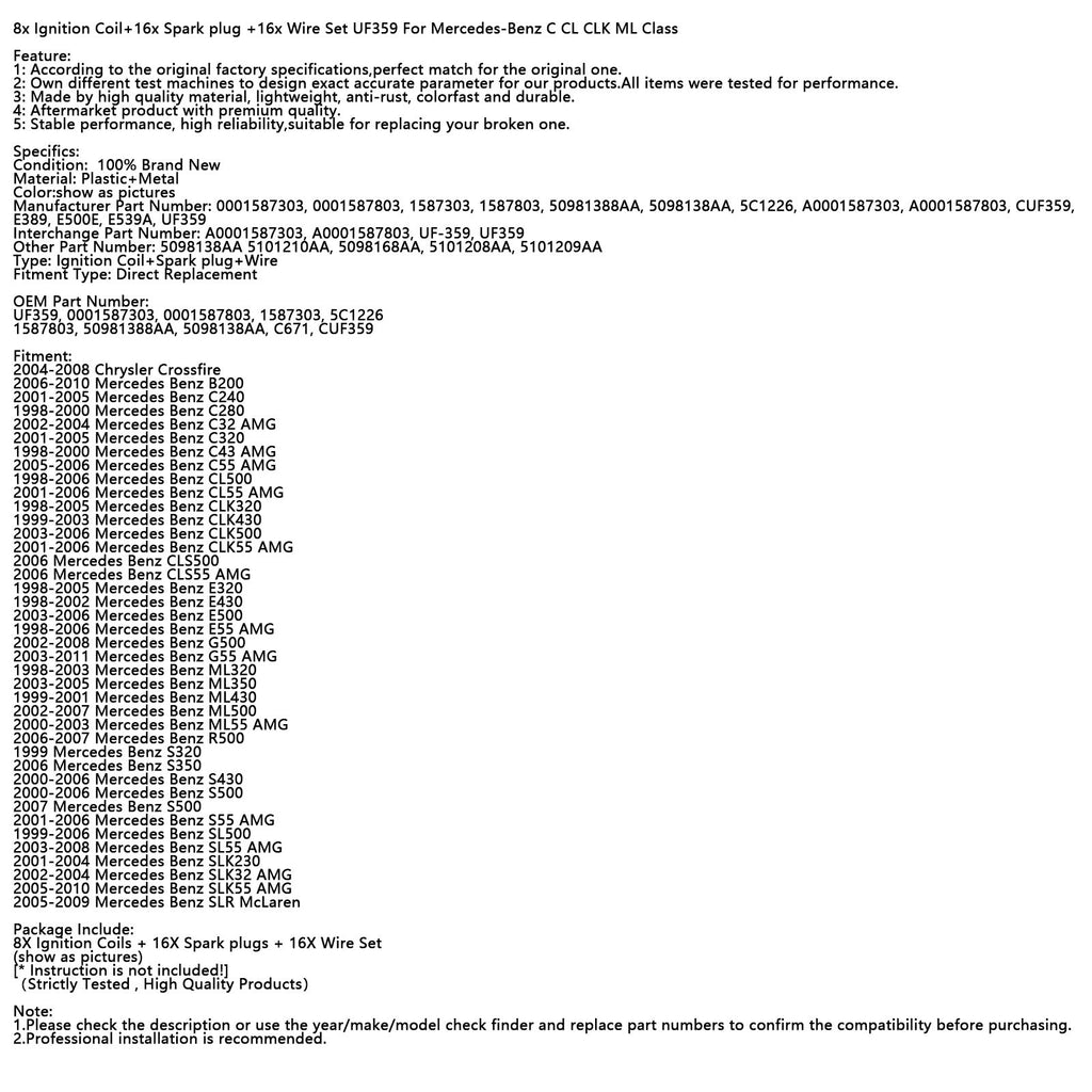 8x Ignition Coil+16x Spark plug +16x Wire Set UF359 For Mercedes-Benz C CL CLK ML Class