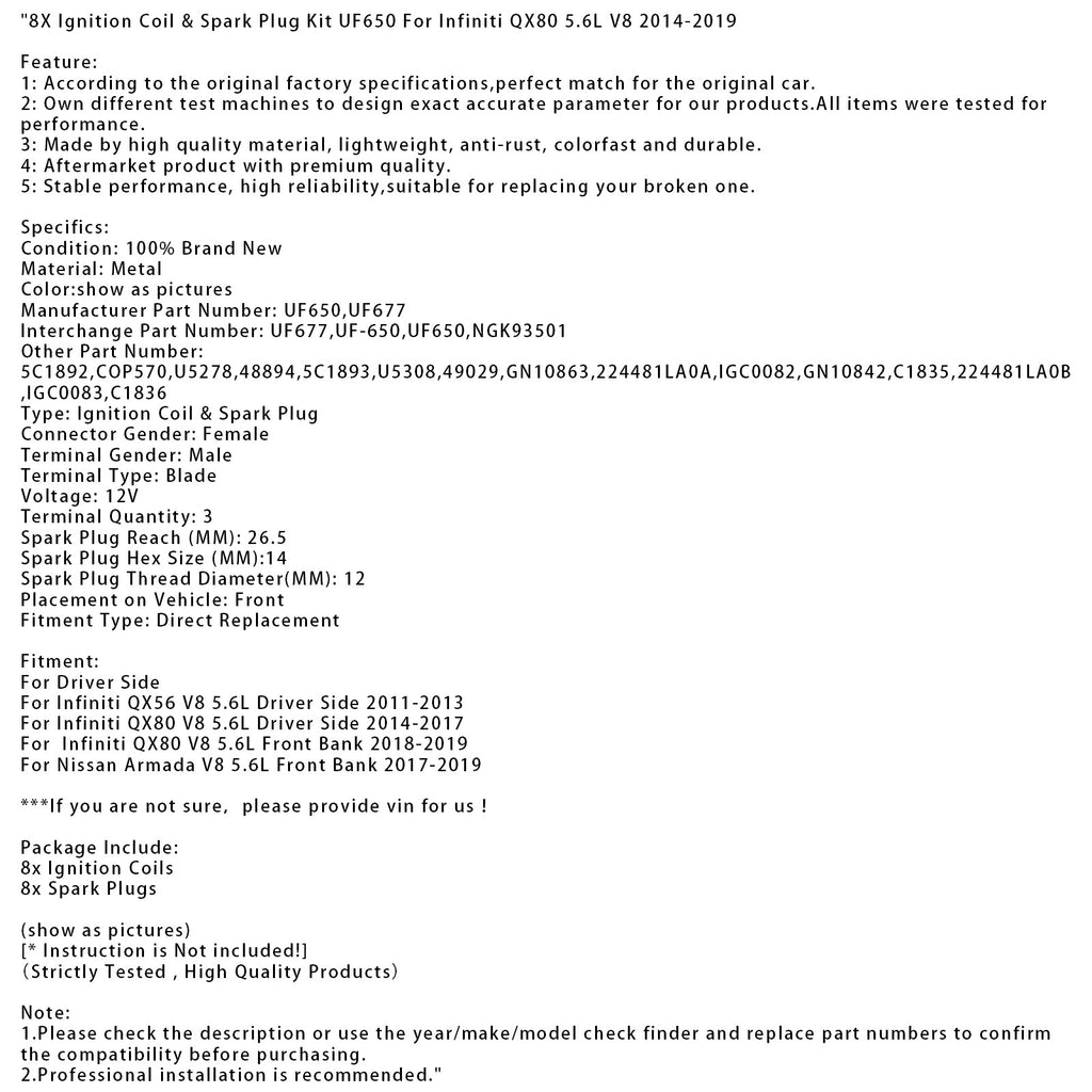 8X Ignition Coil & Spark Plug Kit UF650 Fit For Infiniti QX80 5.6L V8 2014-2019