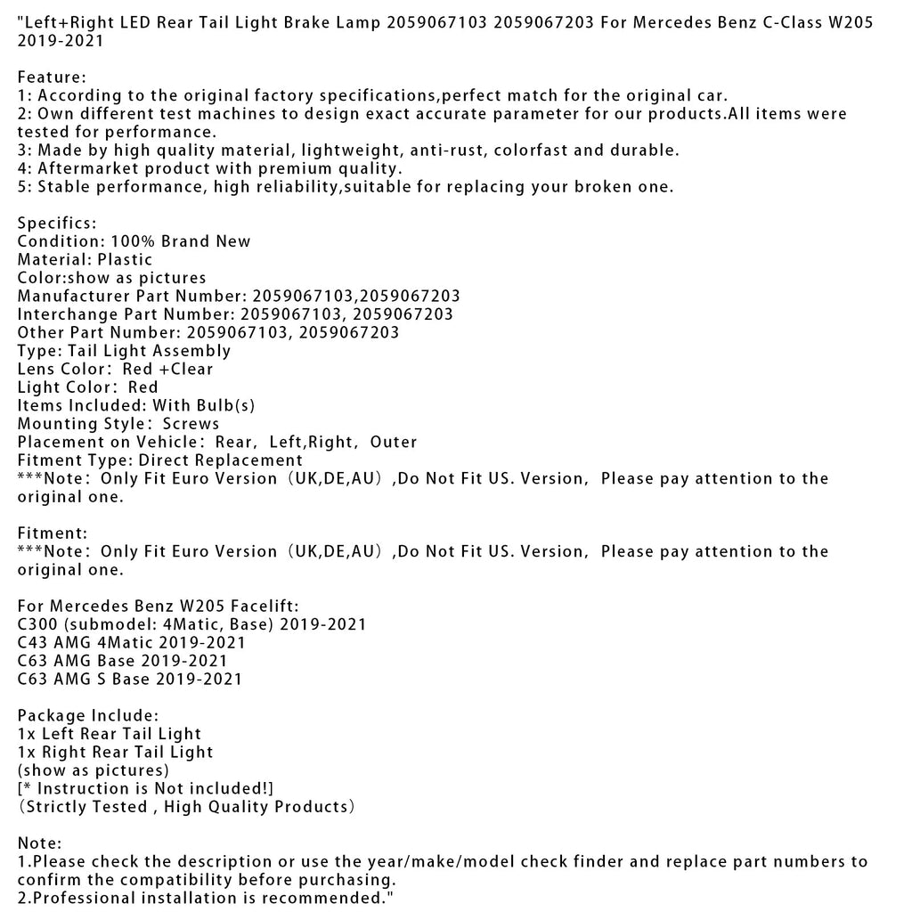 2019-2021 Mercedes Benz W205 Facelift C63 AMG Base Left+Right LED Rear Tail Light Brake Lamp 059067103 2059067203