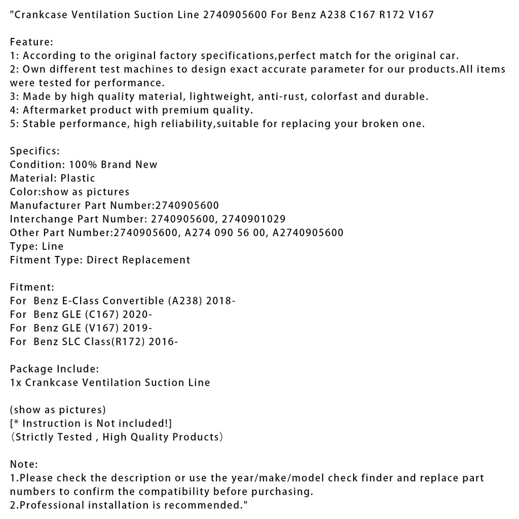 Crankcase Ventilation Suction Line 2740905600 Fit For Benz A238 C167 R172 V167