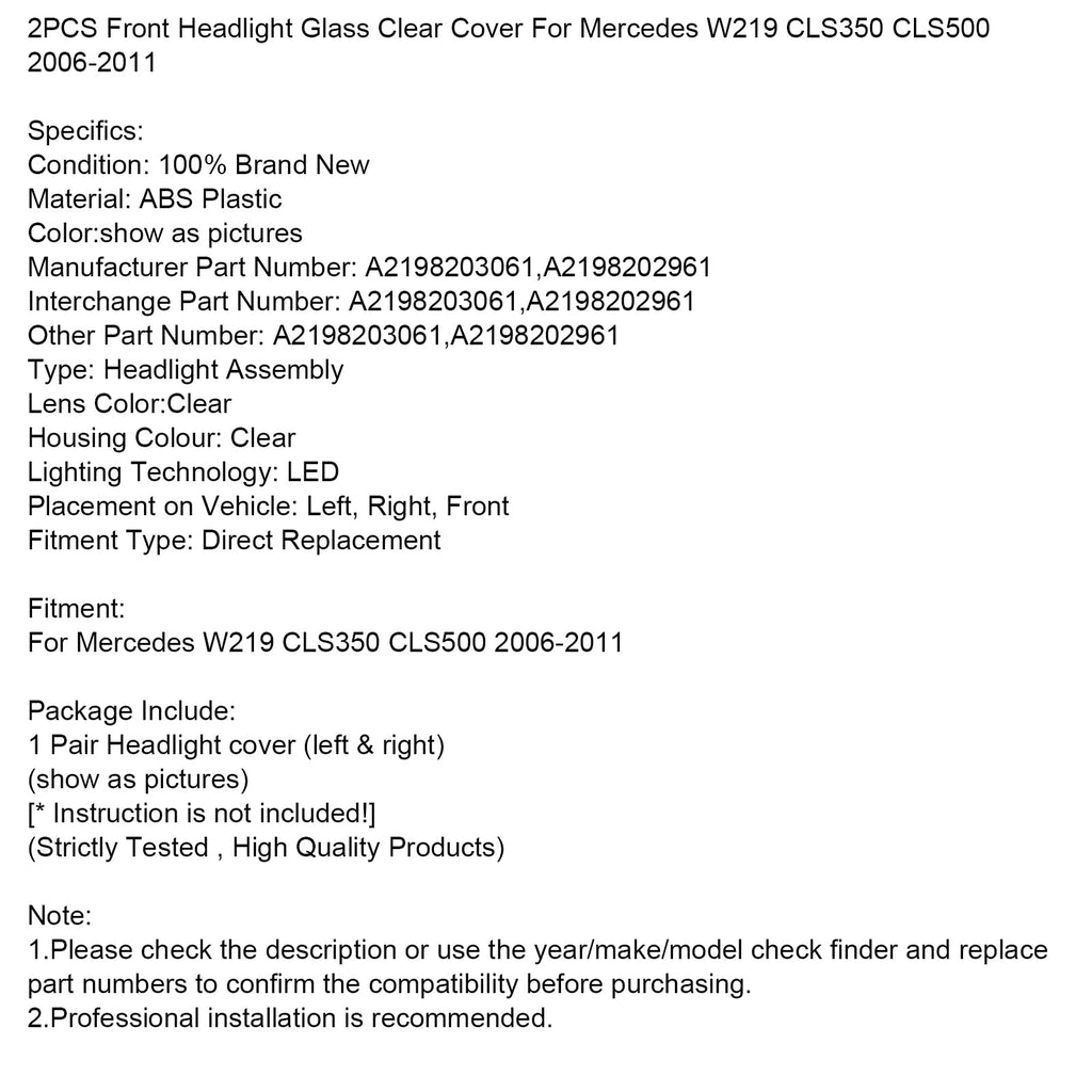2PCS Front Headlight Glass Clear Cover For Mercedes W219 CLS350 CLS500 2006-2011