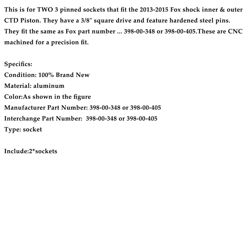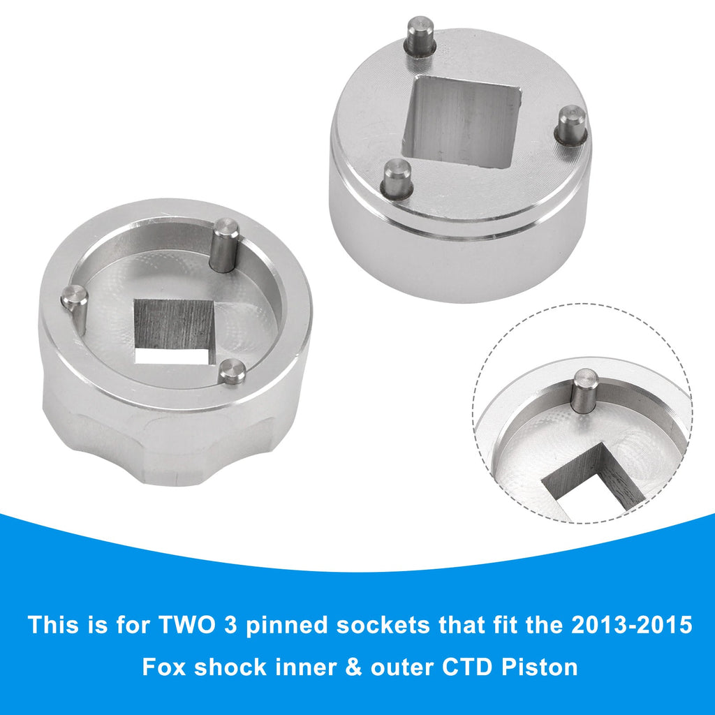 This is for TWO 3 pinned sockets that fit the 2013-2015 Fox shock inner & outer CTD Piston. They have a 3/8" square drive and feature hardened steel pins. They fit the same as Fox part number ... 398-00-348 or 398-00-405.These are CNC machined for a precision fit.