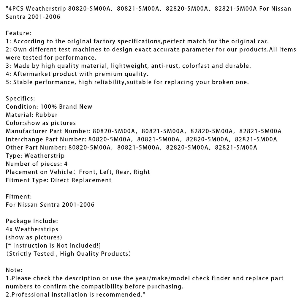 4PCS Weatherstrip 80820-5M00A,80821-5M00A,82820-5M00A,82821-5M00A For Nissan Sentra 2001-2006