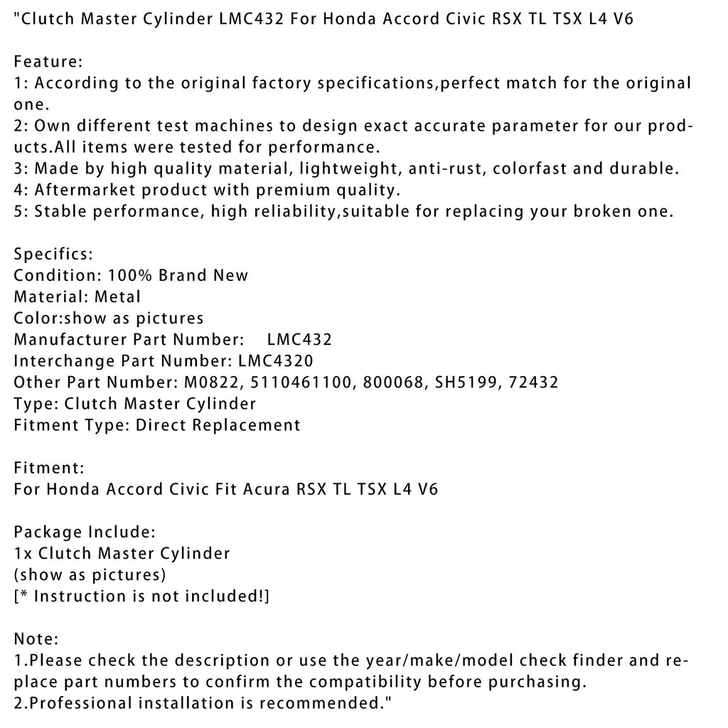 Clutch Master Cylinder LMC432 For Honda Accord Civic RSX TL TSX L4 V6