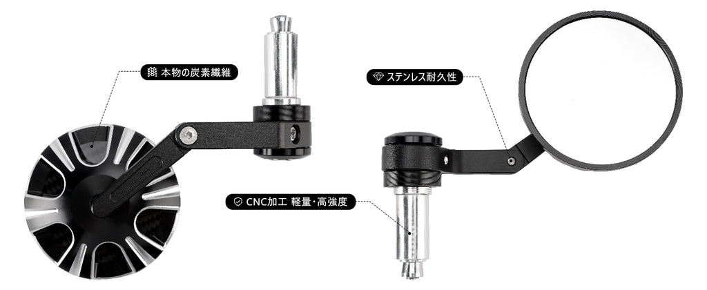 Mirrors are completely CNC machined from billet aluminum (not cast), light-weight, strong, and fully adjustable in every direction to fit just about any rider.