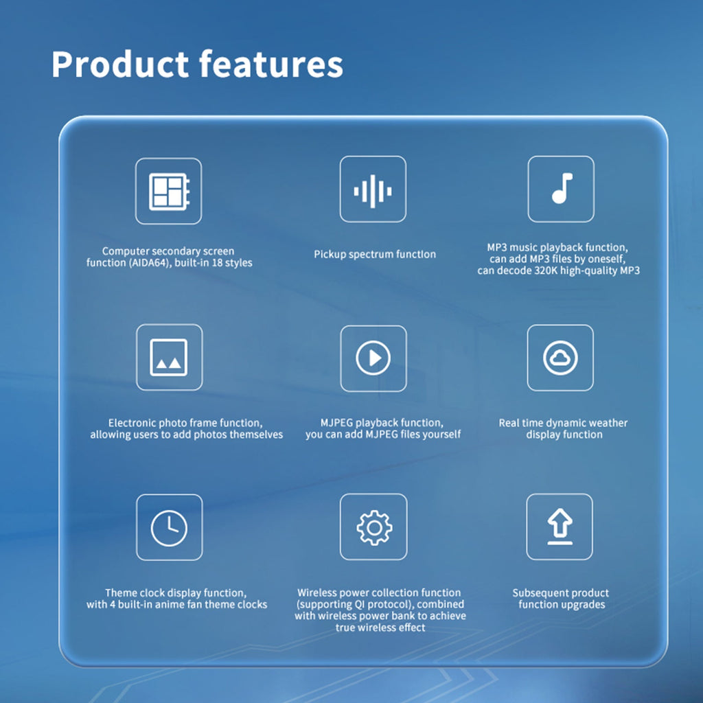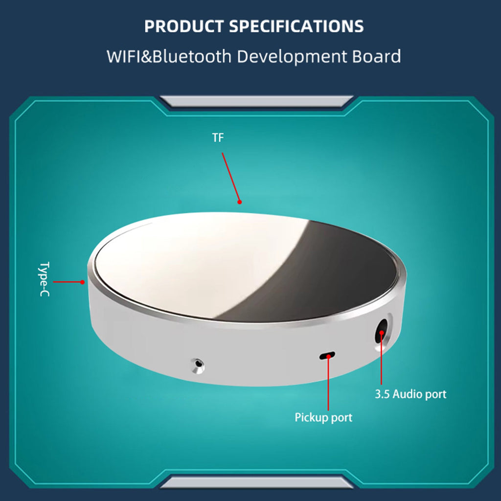 The display screen resolution is 360X360 with capacitive touch. The module includes LCD display, backlight control circuit, touch screen control circuit, 12S digital microphone circuit, 12S analog to digital conversion circuit, TF card interface, wireless power supply circuit.