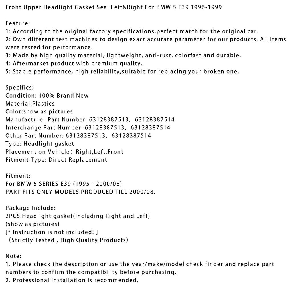 Front Upper Headlight Gasket Seal Left&Right For BMW 5 E39 1996-1999