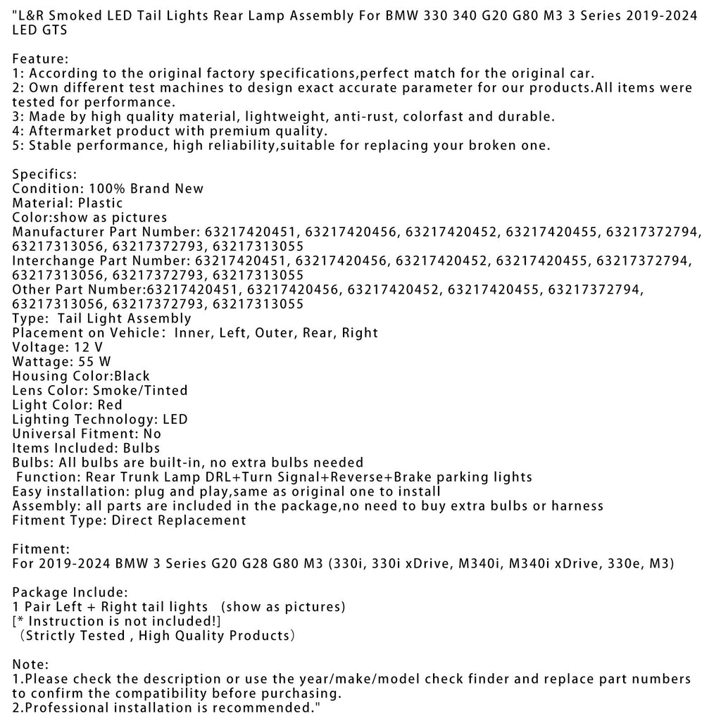 L&R Smoked LED Tail Lights Rear Lamp Assembly For BMW 330 340 G20 G80 M3 3 Series 2019-2024 LED GTS