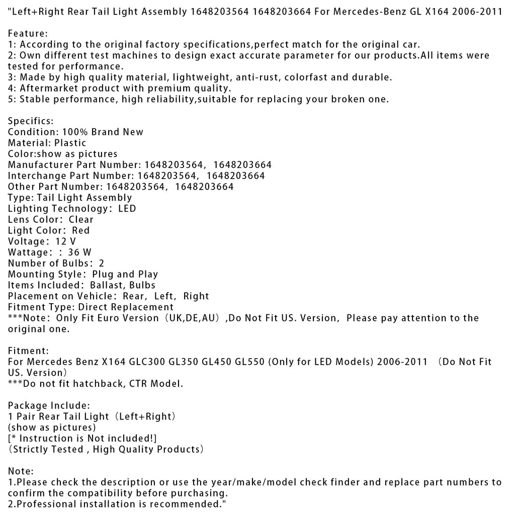 2006-2011 Mercedes Benz X164 GLC300 GL350 GL450 GL550 Left+Right Rear Tail Light Assembly 1648203564 1648203664