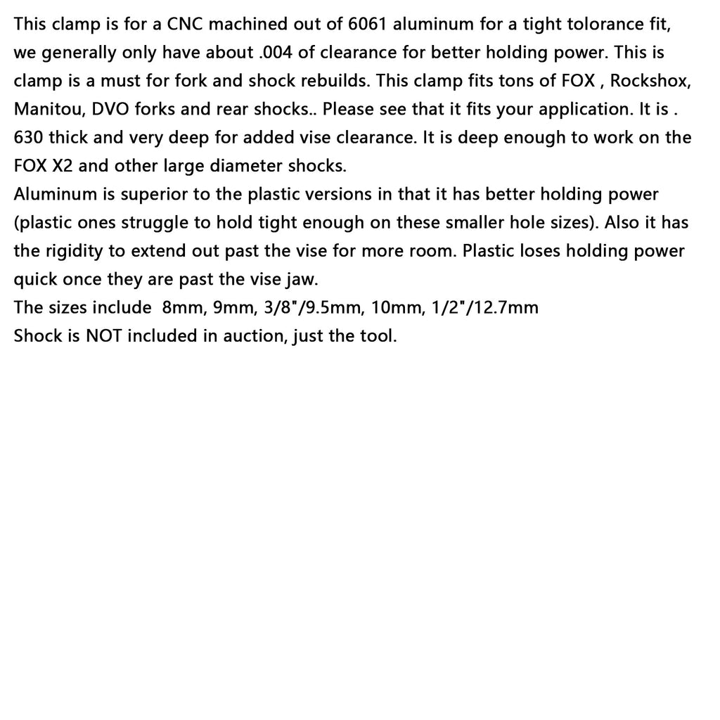 This clamp is for a?CNC?machined out of 6061 aluminum for a tight tolorance fit, we generally only have about .004 of clearance for better holding power. This is clamp is a must for fork and shock rebuilds. This clamp fits tons of FOX , Rockshox, Manitou, DVO forks and rear shocks..?Please see that it fits your application. It is .630 thick and very deep for added vise clearance. It is deep enough to work on the FOX X2 and other large diameter shocks.