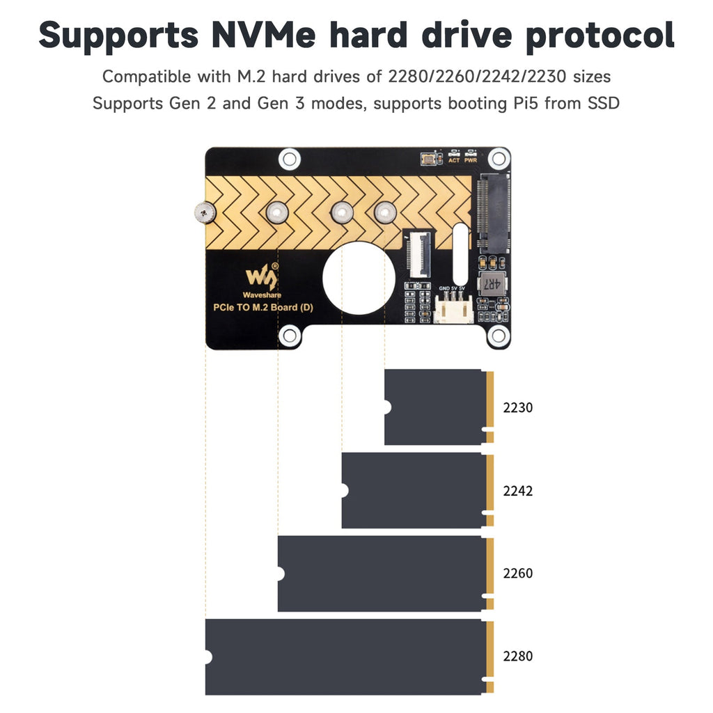 Support NVMe hard disk protocol, M.2 hard disk compatible with 2280 /2260 7 2242 /2230 size supports Gen2 and Gen3 mode, supports starting PI5 from SSD