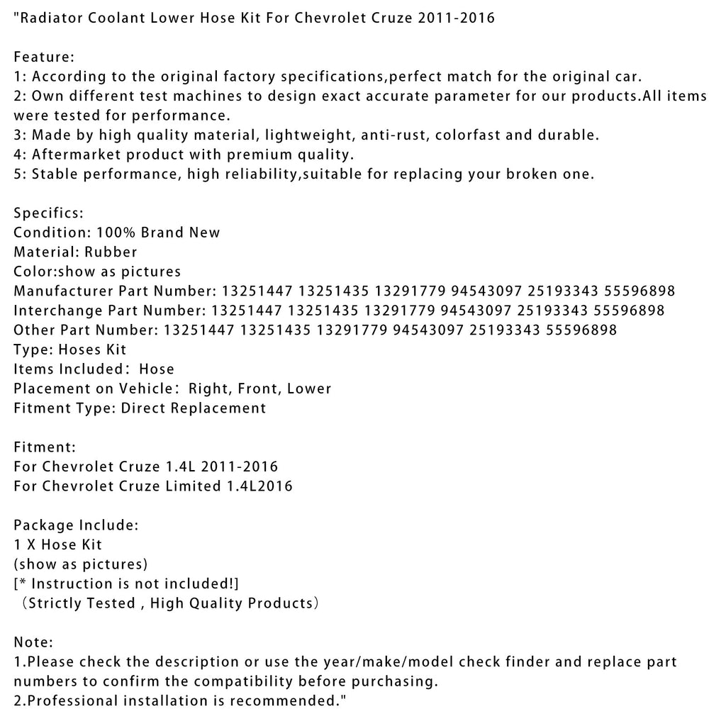 2011-2016 Chevrolet Cruze 1.4L Radiator Coolant Lower Hose Kit 13251447 13251435
