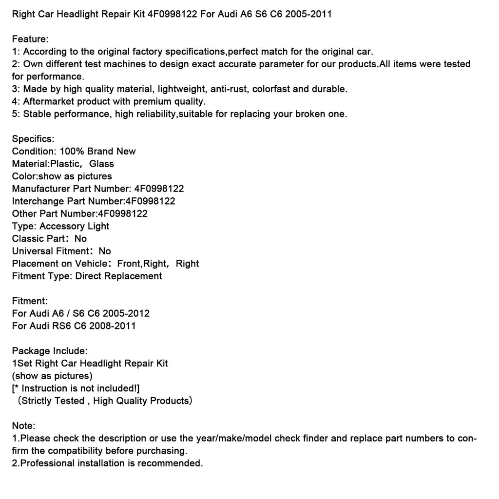 Right Car Headlight Repair Kit 4F0998122 For Audi A6 S6 C6 2005-2011