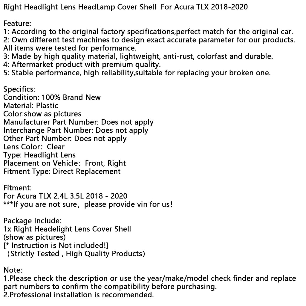 Right Headlight Lens HeadLamp Cover Shell For Acura TLX 2018-2020